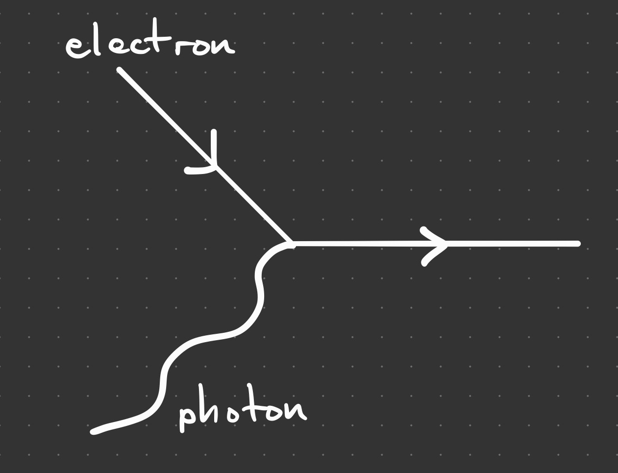 Now we will see why coupling the electron and the photon leads to trouble. An interaction occurs at a point in spacetime where two particles make contact. A photon can interact with an electron as shown in the diagram.