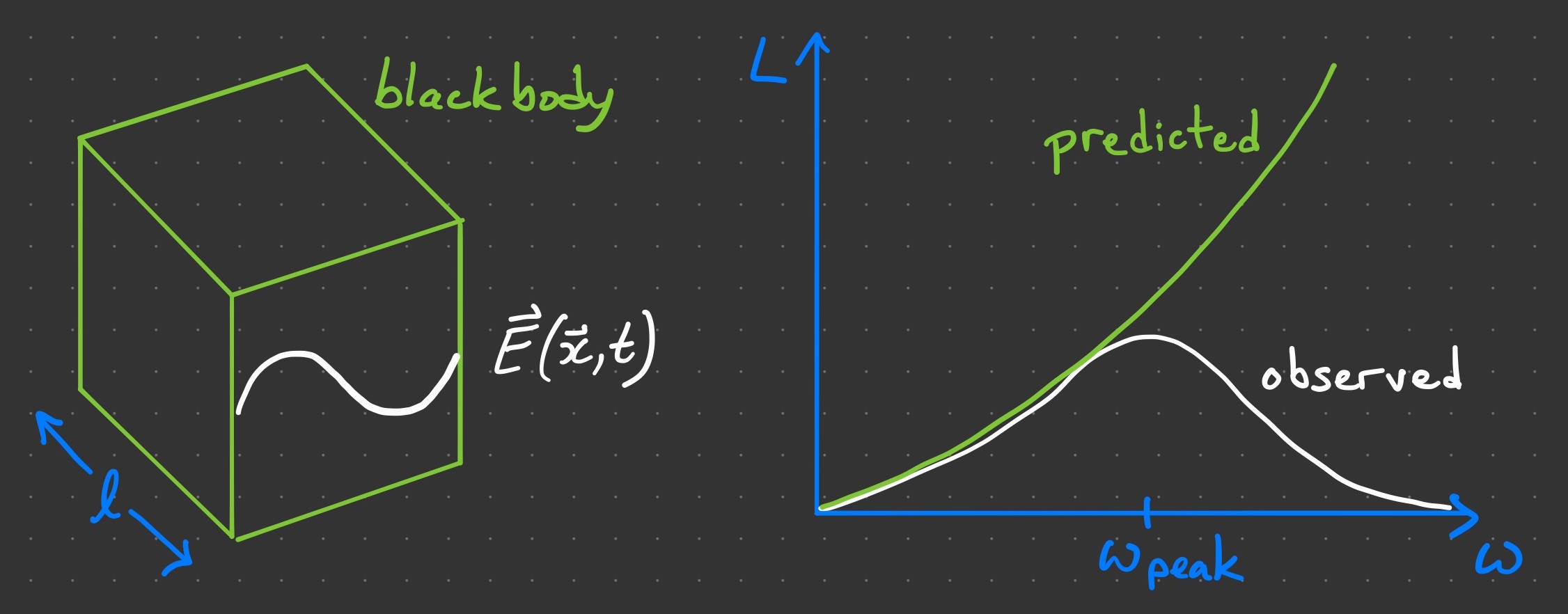 Our prediction assumed that all modes have the same energy cost, a result from statistical physics known as the equipartition theorem. One can spend every bit of their energy budget on making red light, or blue light, or any color of light. The stroke of genius came to Max Planck in the year 1900. What if light was not a continuous fluid but instead was granular—made up of discrete packets, each one called a quantum? By assigning each quantum of light the cost , Planck found that the ultraviolet catastrophe disappeared and that the predicted spectrum matched observation perfectly. Now you could not spend your entire energy budget on making any color of light because each color requires you to divide your budget into differently sized quanta of